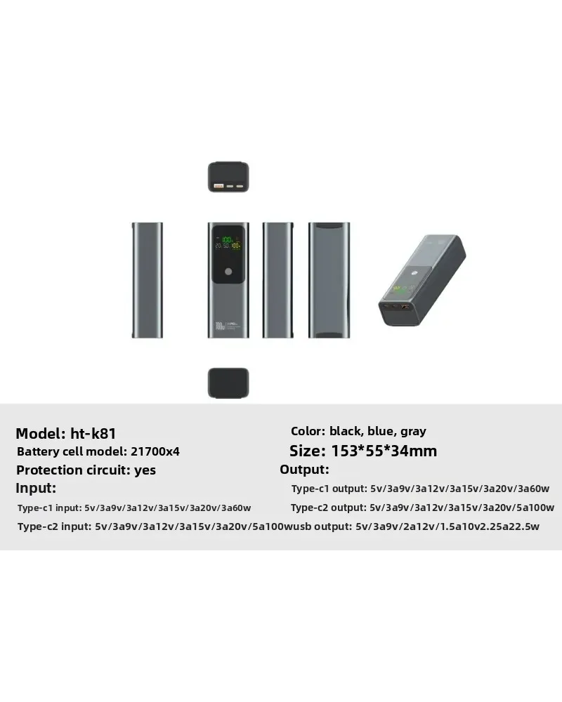 SPECIFICATIONSBattery Type: Lithium BatteryBrand Name: NoEnName_NullColor: Black, blue, gray.Features: Digital DisplayFunction 1: 100W two-way fast chargingFunction 2: Fast chargeable laptopHign-concerned... Read more