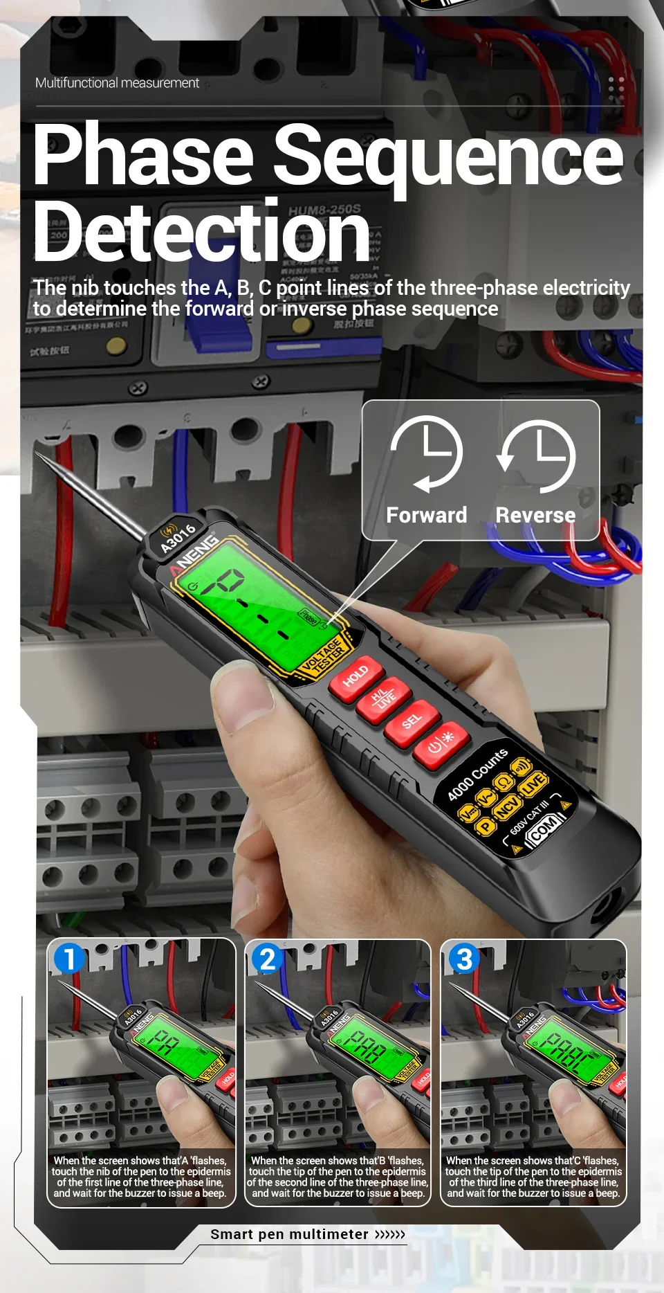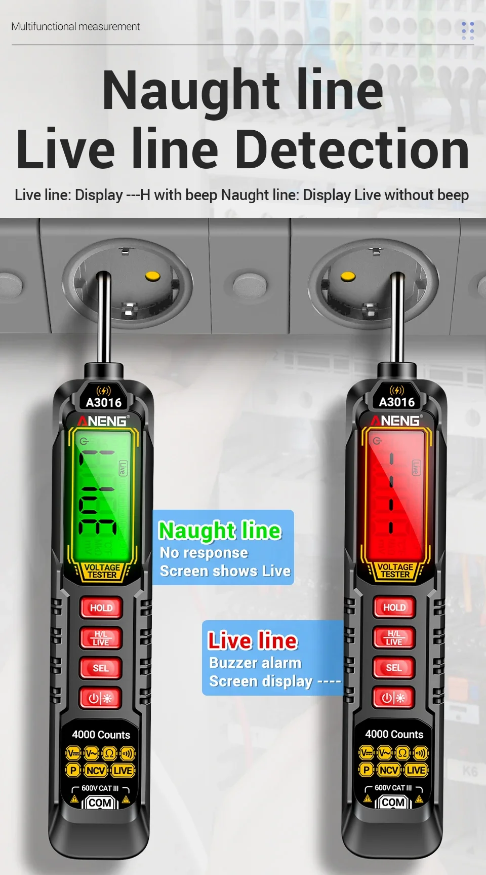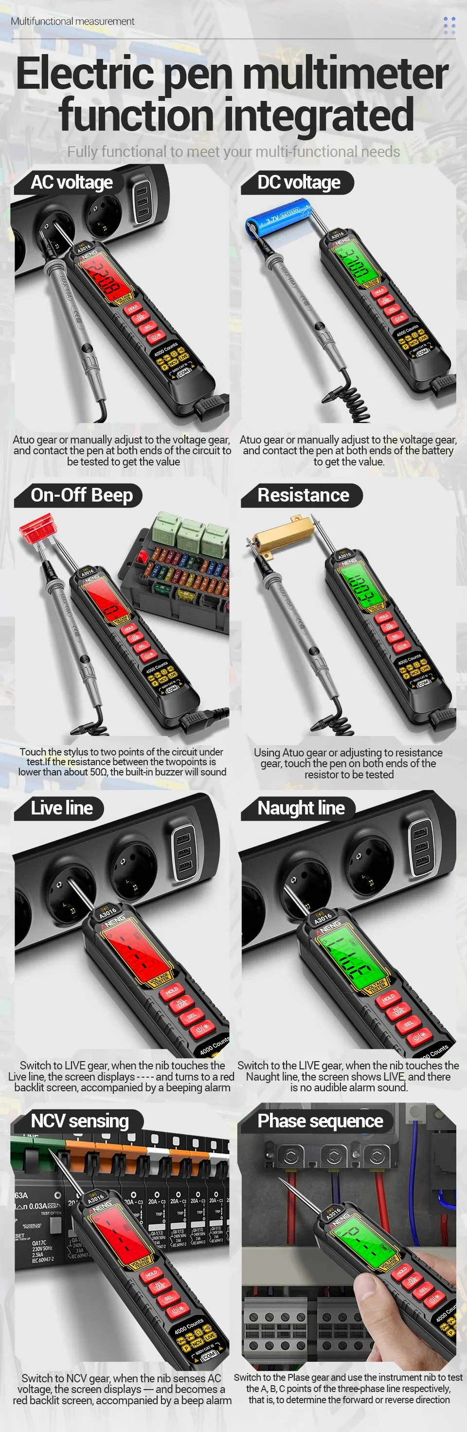 1. Multi functional real-time detection: AC/DC voltage detection, switch testing, resistance testing, on-off measurement, phase sequence measurement, data storage.