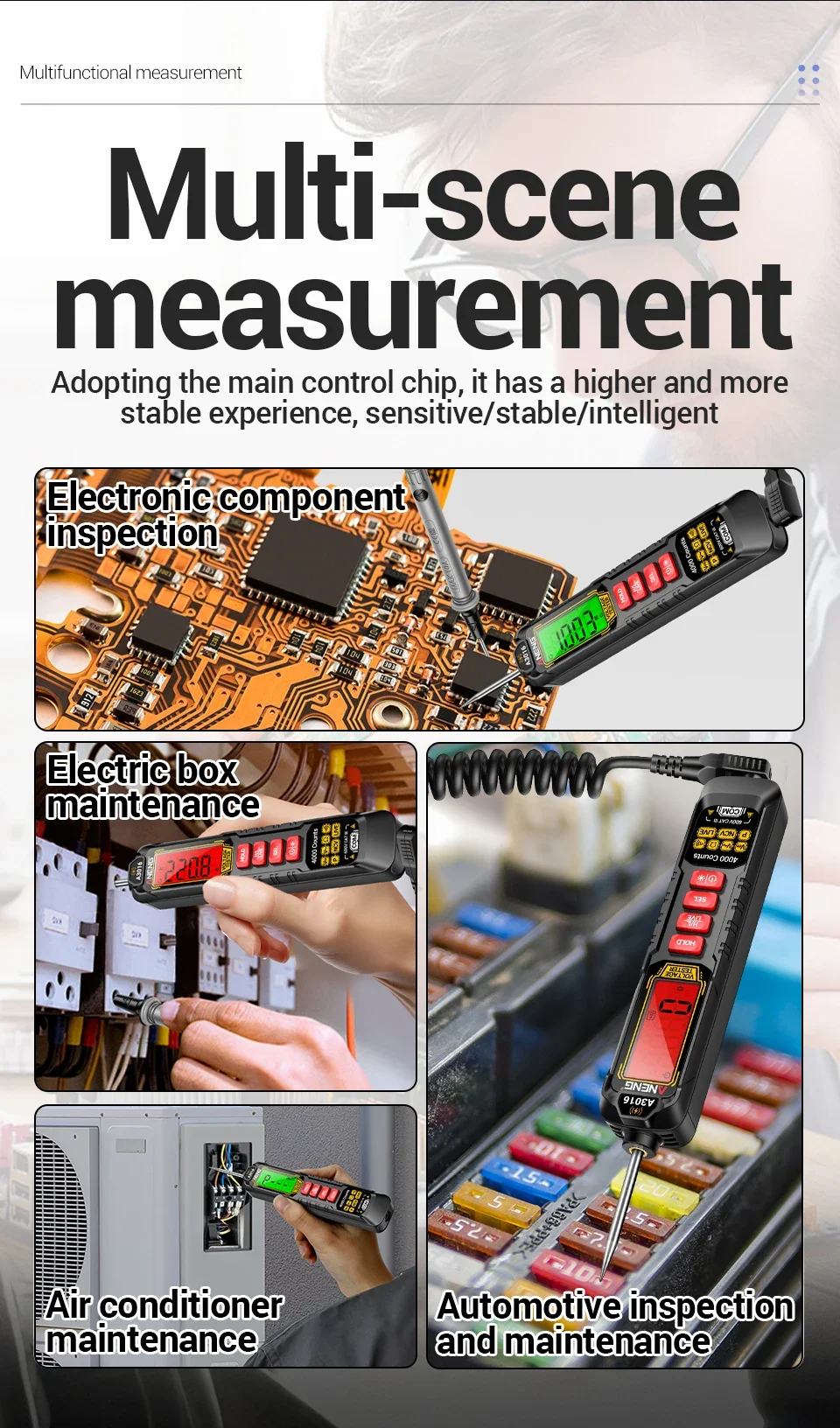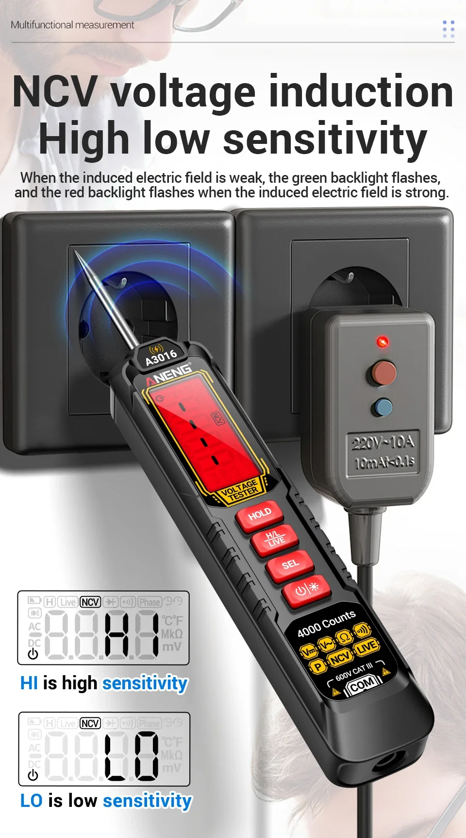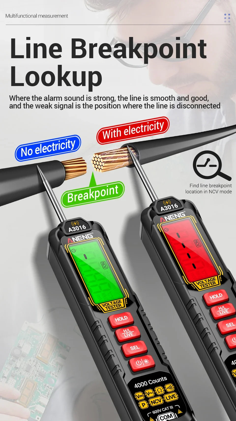 1. Multi functional real-time detection: AC/DC voltage detection, switch testing, resistance testing, on-off measurement, phase sequence measurement, data storage.