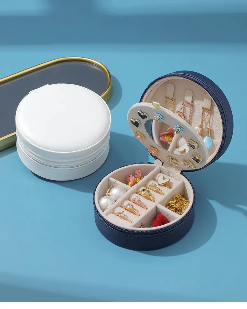This travel jewelry organizer is a small but large-capacity round box. This lightweight jewelry travel case can hold multiple earrings, rings, necklaces, and bracelets.