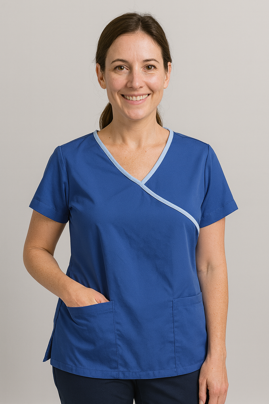 Made from lightweight, breathable, and durable fabric, it ensures all-day comfort during long shifts. The V-neck design allows easy movement, while the functional front pockets provide convenient storage for essentials like pens, phones, or medical tools.