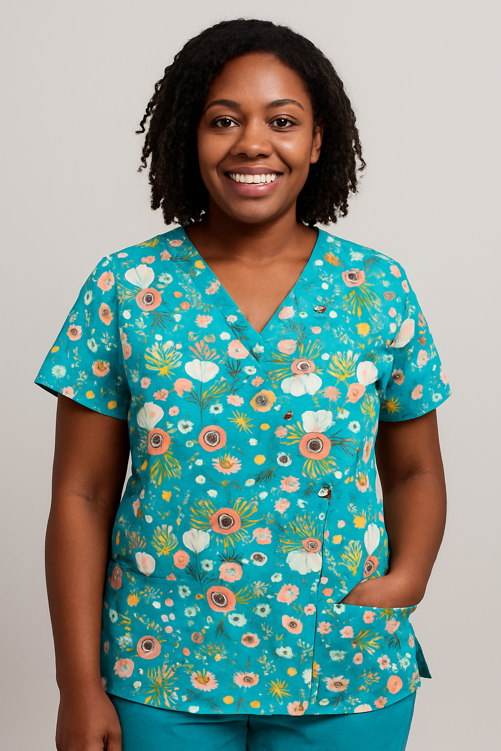 Add color and comfort to your workday with this Women’s Floral Scrub Top, designed for healthcare professionals who want both style and functionality. Featuring a beautiful floral print on a teal background, this scrub top brings a fresh and professional look to hospitals, clinics, and medical offices.